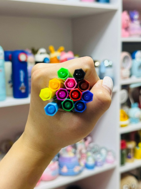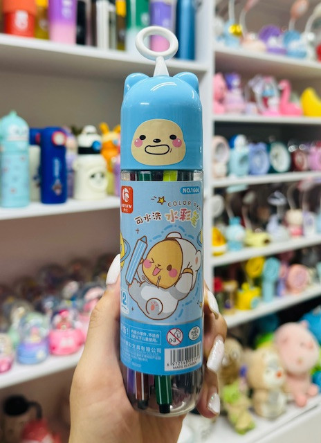 ماژیک 12 رنگ با بسته بندی استوانه ای شکل با طرح کیوت که در آن تعداد دوازده عدد ماژیک به رنگ های مختلف قرار دارد