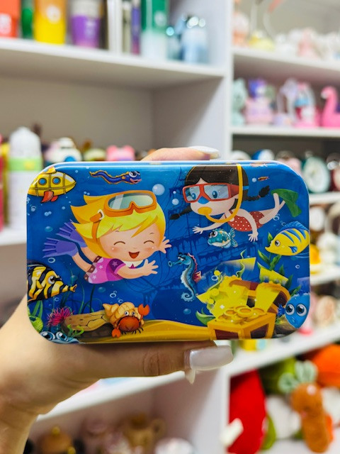 پازل 60 تکه جعبه فلزی از جنس مقوای فشرده ساخته شده اند . این پازل ها دو رو هستند . یک سمت آن طرح و سمت دیگر اعداد نوشته شده است. تا کودک بتواند از طرف دیگر آن برای تکمیل پازل کمک بگیرد .